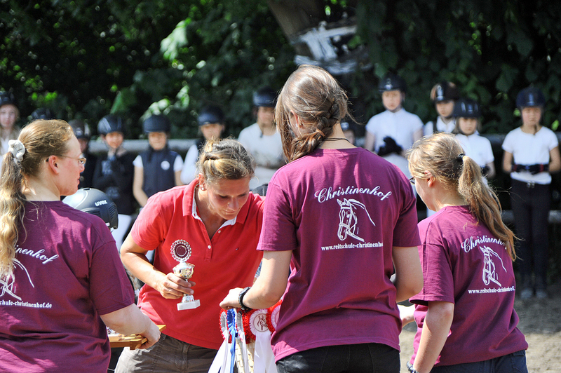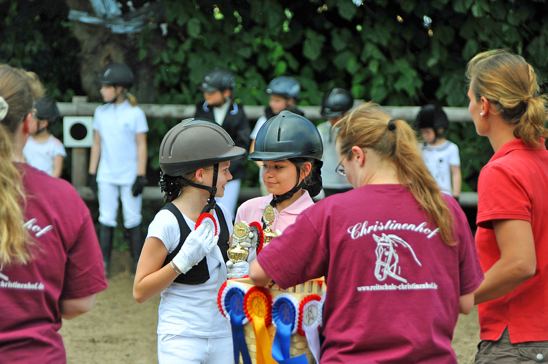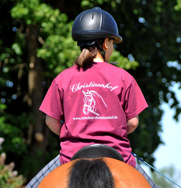Bei diesen Prüfungen bitte Reithosen tragen - wenn ihr mehrere haben solltet, dann eure hellsten. Selbstverständlich ist eine Reitkappe, lange Haare bitte zusammen nehmen. An den Füßen Reitstiefel oder Stiefelletten mit Chaps - auf Hochglanz geputzt! KEINE Schals, Tücher oder dicken Jacken. Als Oberteil einen schwarzen/dunklen Pulli oder Weste und darunter eine weiße/helle Bluse oder T-Shirt, in dem ihr bei Hitze auch ohne Pulli/Weste reiten könnt. Klasse sind natürlich auch die Christinenhof-Pullis mit einem weißen Blusen- oder Polo-Shirtkragen oder die Christinenhof-T-Shirts!