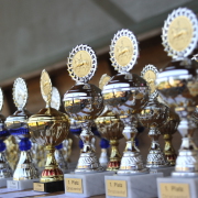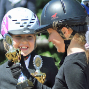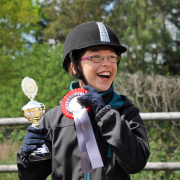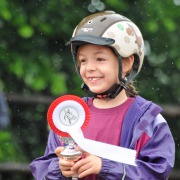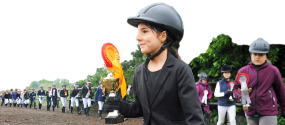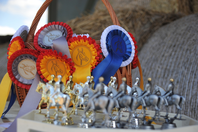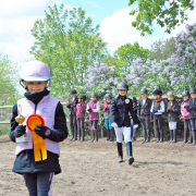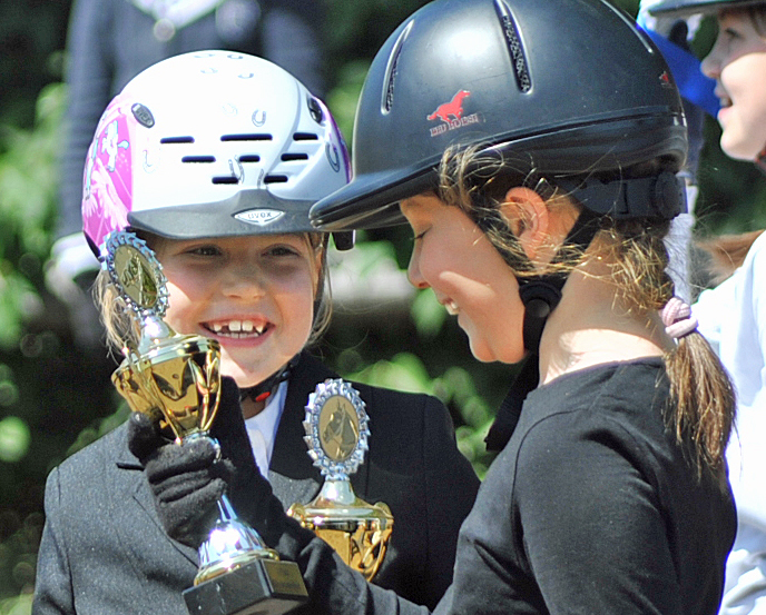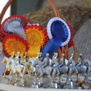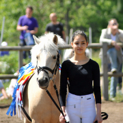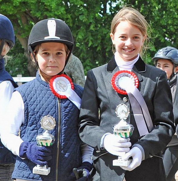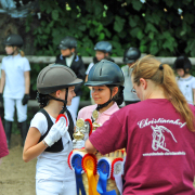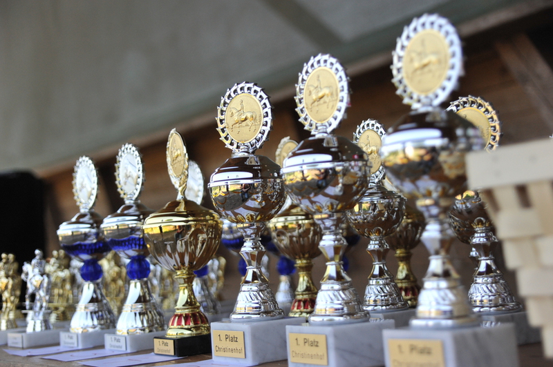Dabei sein ist alles - und jeder Teilnehmer erhält nicht nur Aufmerksamkeit und Applaus, sondern auch noch eine Turnierschleife als Andenken. Je nach Platzierung wird bei der Siegerehrung dann eine gelbe (1. Platz), silberne (2.), weiße (3.), blaue (4.), rote (5.), grüne (6. und alle anderen Platzierten) oder braune (alle Nicht-Platzierten) Schleife durch die Richterin überreicht. Die besten Reiter ihrer Altersklasse und Prüfung erhalten bei uns auch noch schöne Pokale (s. Foto oben) als Erinnerung an dieses unvergessliche Ereignis!