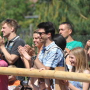 Hier könnt ihr kommen, wie ihr euch am wohlsten fühlt. Zu beachten ist nur, dass man lange Hosen, feste Schuhe und der Reiter eine Reitkappe trägt und lange Haare zusammen genommen werden. Bei der Farbwahl könnt ihr - müsst aber nicht - euch an den Farben für die Reiterwettbewerbe orientieren: Schuhe dunkel, Hosen weiß/hell, Oberteil schwarz/dunkel und darunter etwas Weißes/Helles, in dem man bei Hitze auch so reiten kann. Toll wäre es, wenn das Outfit von Reiter und Führer ähnlich ist oder ähnliche Akzente hat (z.B. angestecktes Blümchen), denn das gibt ein besonders harmonisches Gesamtbild!