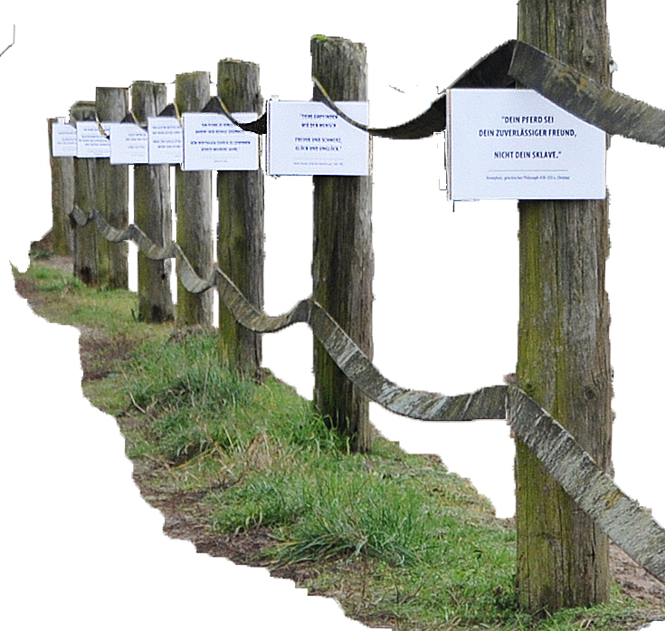 Für alle, die selbst so einen Weg bauen wollen: Nach etwas experimentieren hat sich bewährt, je 2 Siebdruckplatten (12mm in A4-Größe) so an jeden Zaunpfahl zu schrauben, dass sich die kurzen Seiten berühren und auf der anderen Seite die Pferde nicht reinbeißen können. Die Zitate auf normales 80g Papier drucken und laminieren (125 micron-Folie). Diese dann mit Tesa-Powerbond outdoor ankleben (Ecken+Mitte reicht). Das ist kostengünstig, sollte mehrere Jahre halten und die Zitate lassen sich auch mal leicht austauschen.