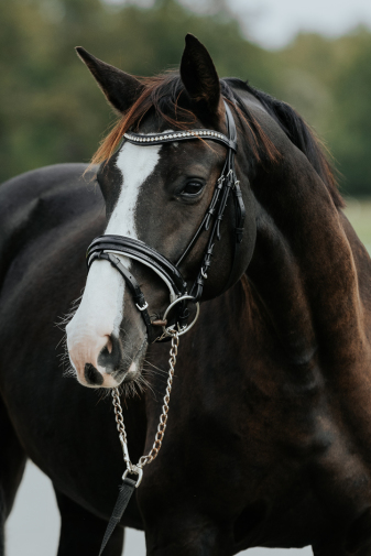 Räubertochter ist eine bildschöne Rappstute mit vier weißen Beinen und Blesse. Sie ist ein absoluter Schatz, egal ob im Stall oder unter dem Reiter, egal ob Halle, Platz oder Gelände.